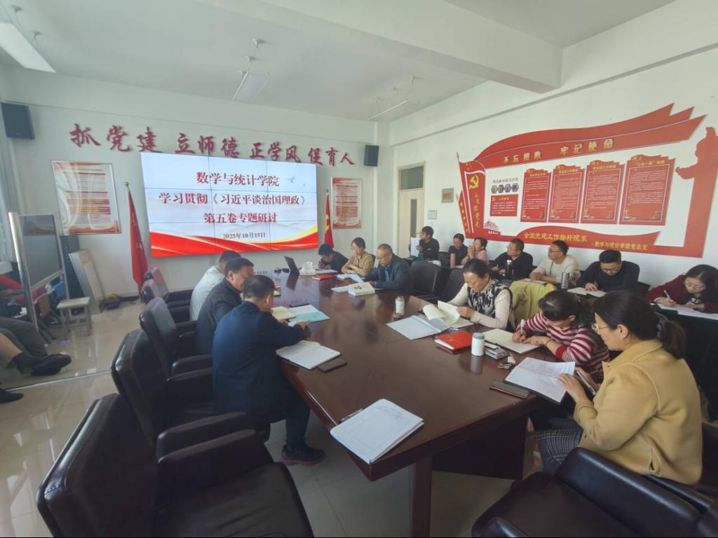 为深入学习贯彻习近平新时代中国特色社会主义思想和党的二十大精神,让全体教师深刻了解马克思主义中国化时代化的最新成果。数学与统计学院党委于2025年10月15日下午在西三楼会议室开展学习《习近平谈治国理政》第五卷专题研讨,集中学习《习近平谈治国理政》第五卷中部分内容。会议由数学与统计学院党委书记索南任欠主持,数学与统计学院全体教工参加了会议。