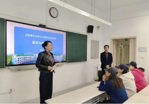 宣讲会伊始,我院张淑敏副书记致辞,向同学们隆重介绍了王建锋教授的学术背景与研究成果,为宣讲会拉开序幕。随后,王建锋教授围绕山东理工大学数学与统计学院研究生招生事宜展开详细讲解,内容涵盖学校与学院概况、学科与研究方向、招生专业目录、培养成果、奖励政策五大核心板块。宣讲过程中,王建锋教授还分享了山东理工大学的校园环境与淄博当地文化特色,进一步帮助同学们对山东理工的了解。