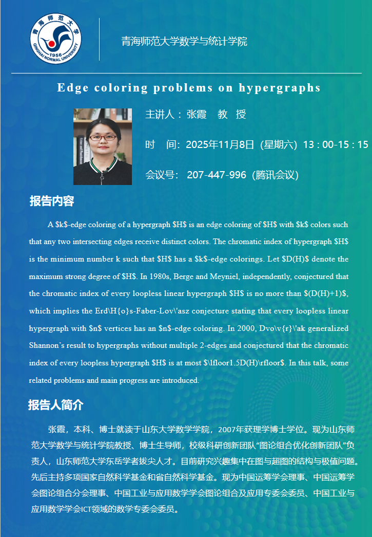 讲座(在线):11月8日 张霞 Edge coloring problems on hypergraphs
