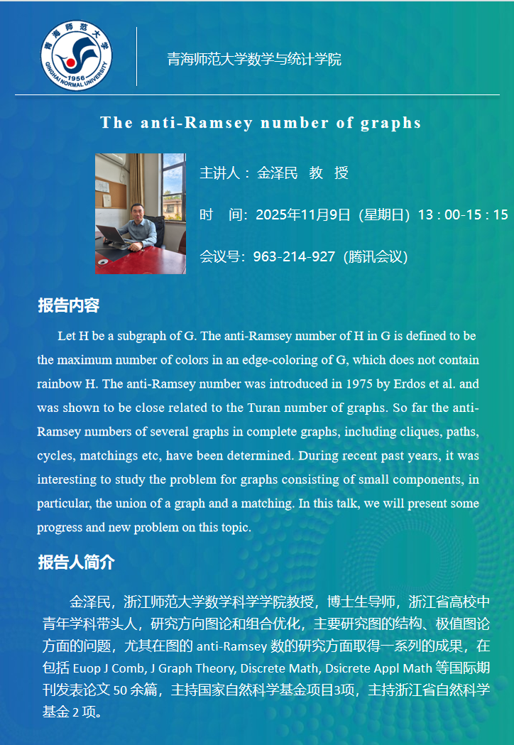 讲座(在线):11月8日 金泽民 The anti-Ramsey number of graphs