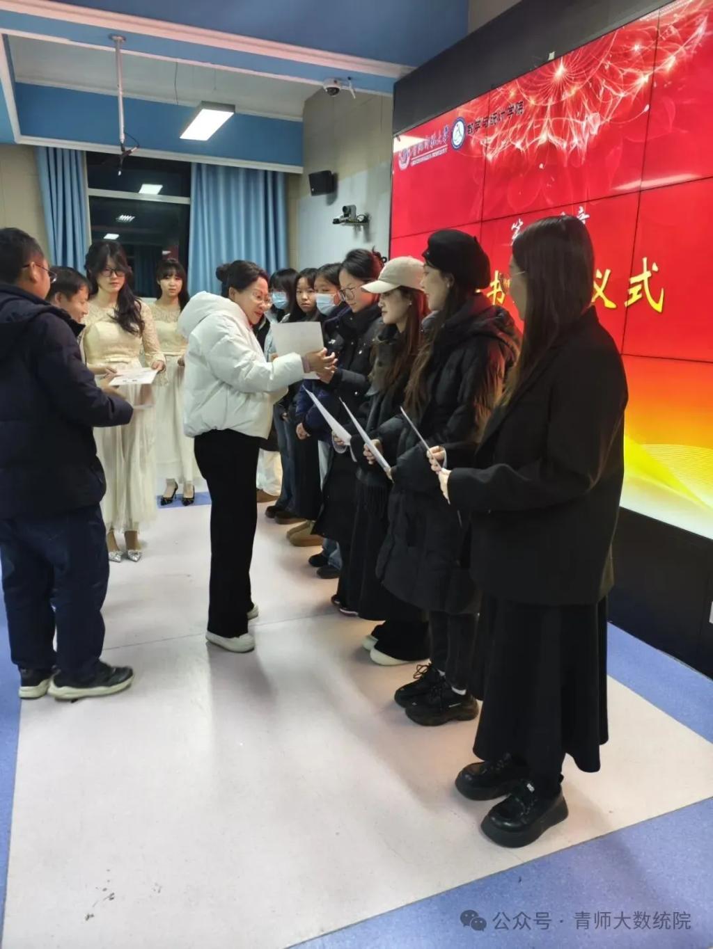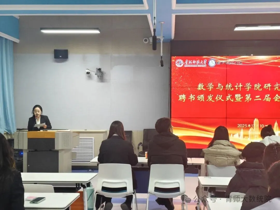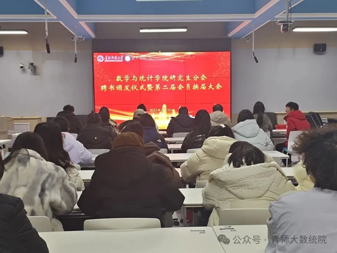 为进一步加强学院研究生分会组织建设,规范干部队伍管理,传承服务精神,凝聚青春力量,充分发挥研究生分会在连接学院与广大研究生之间的桥梁纽带作用,2025年12月10日,数学与统计学院在城西校区理科楼410教室圆满举行研究生分会换届大会暨聘书颁发仪式。学院党委副书记张淑敏、副院长邓波、院长助理林震、研究生导师张冬莉、研究生党支部书记朱波、团总支书记姚怡扬、研究生辅导员胡少琦及研究生分会全体干部出席本次大会。大会由第一届研究生分会副主席高琴主持。