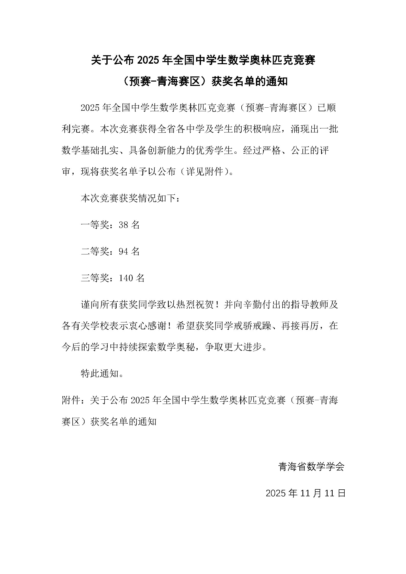 关于公布2025年全国中学生数学奥林匹克竞赛(预赛-青海赛区)获奖名单的通知